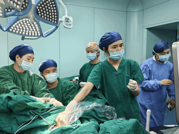 (贾文娟主任团队在实施单孔腹腔镜手术)