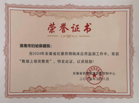 2025年3月8日,在合肥举行的2025年安徽省药事管理质量控制第一次工作会议上,淮南市妇幼保健院凭借监测工作方面的突出表现,在2023年安徽省合理用药监测工作中荣获“杰出成员单位奖”,在2024年安徽省抗菌药物临床应用监测工作中荣获“数据上报完整奖”。