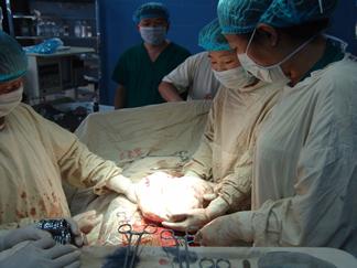 我院妇科收治该患者后高度重视,精心准备。经积极支持治疗后于2009年8月12日实施手术。手术过程顺利,切除一重达4500克的巨大实质性卵巢肿瘤。