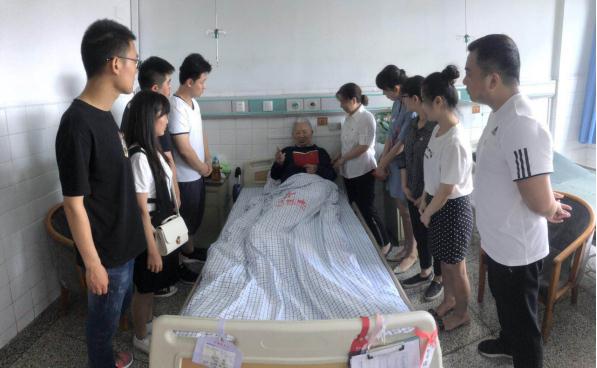 (门诊党支部党员代表在病床前聆听老党员方立民讲述参加平叛战斗和酒泉卫星发射中心建设的亲身经历)