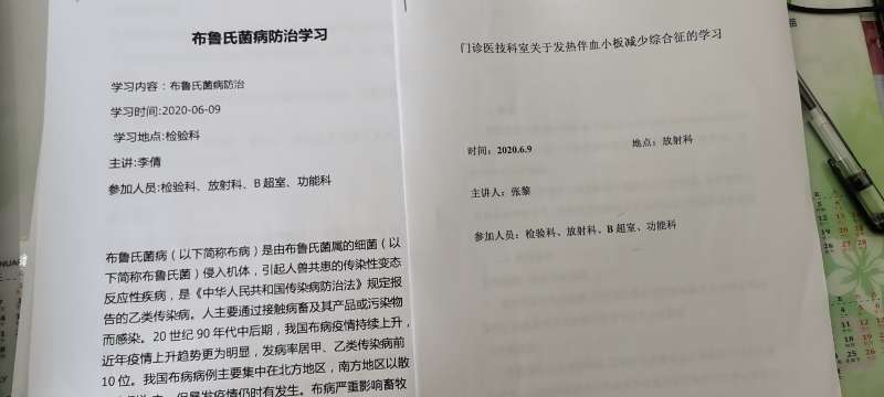 医院于6月8日召开全院中层干部会议传达文件精神。会上,分管副院长倪宁对安徽省发热伴血小板减少综合征防控方案进行了解读,并要求各科室要高度重视,各科室要组织科室工作人员进行学习《发热伴血小板减少综合征》及《布鲁氏菌病防控》,要全面掌握两种疾病的流行病学特点、临床表现、诊断报告、治疗以及预防、控制措施。诊疗中遇到发热病人要详细了解流行病学史,及时发现可疑病人,做到早发现、早诊断、早隔离。