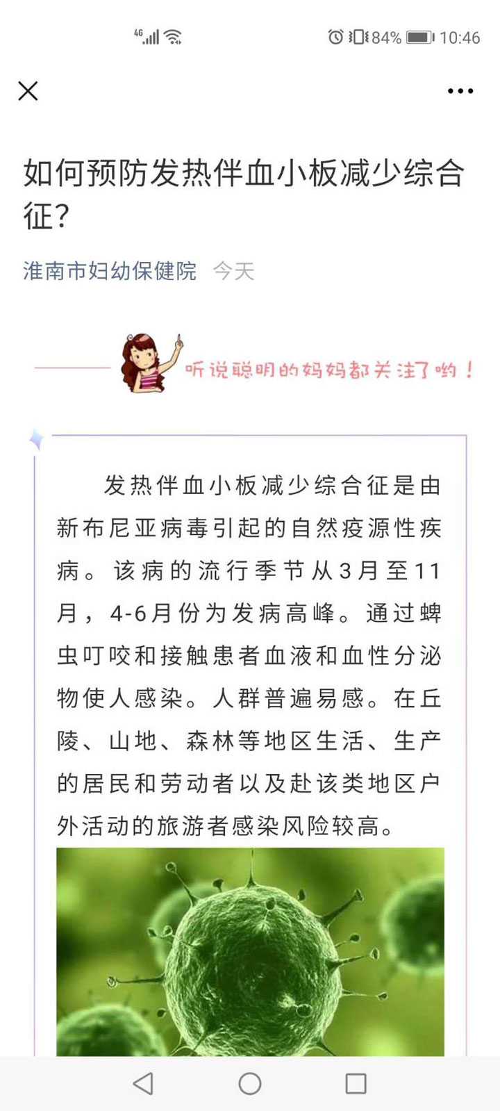 为更好地让公众对疾病防控知识有所了解,6月6日院预防保健科编写制作了《如何预防发热伴血小板减少综合征?》健康教育资讯在医院微信公众号推出,向公众进行宣教。(预防保健科)