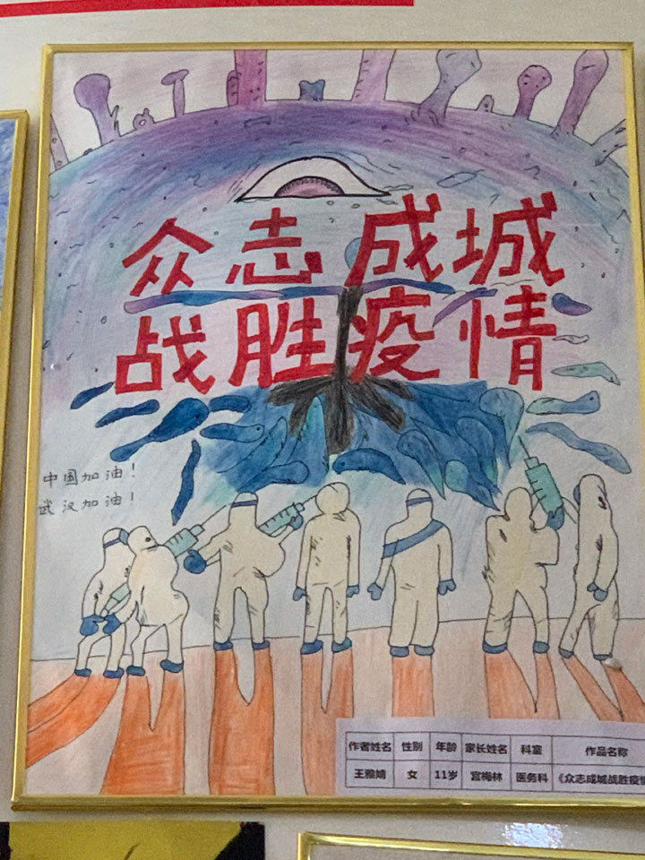 为助力全面打赢新冠肺炎疫情防控阻击战,同时为全院喜欢动手、爱好绘画、乐于创作的小朋友们提供展示平台,在六一国际儿童节来临之际,市妇幼保健院举办了以“加油!中国!共同抗疫!”为主题的儿童书画展,号召全院职工子女用画笔向奋战在抗“疫”一线的白衣天使们表达最崇高的敬意,为他们加油。