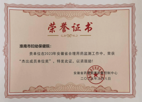 2025年3月8日,在合肥举行的2025年安徽省药事管理质量控制第一次工作会议上,淮南市妇幼保健院凭借监测工作方面的突出表现,在2023年安徽省合理用药监测工作中荣获“杰出成员单位奖”,在2024年安徽省抗菌药物临床应用监测工作中荣获“数据上报完整奖”。